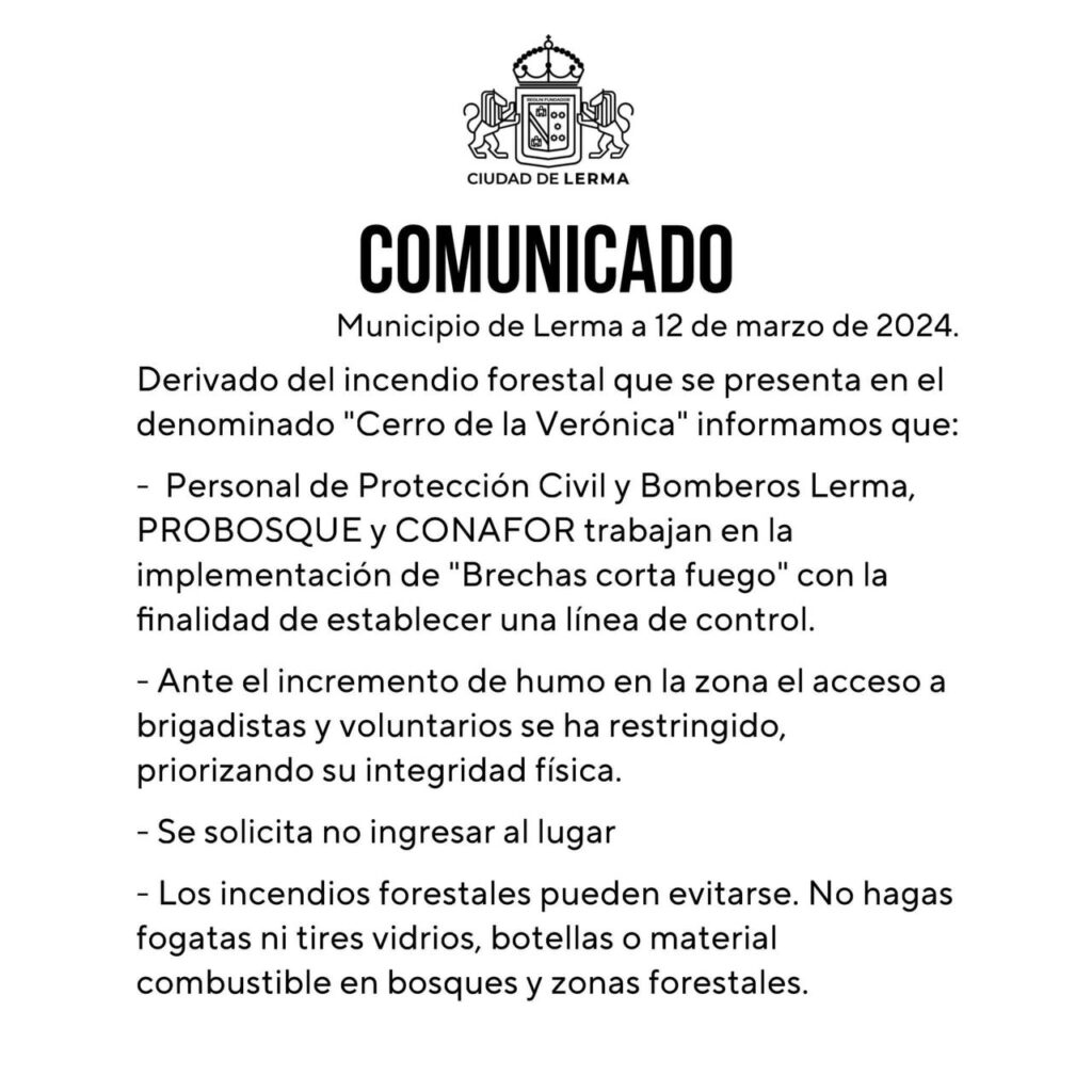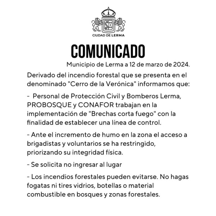 El Ayuntamiento de Lerma informó que, derivado del incendio forestal que actualmente se registra en el «Cerro de la Verónica», personal de Protección Civil y Bomberos Lerma, así como de PROBOSQUE y CONAFOR, trabajan en la construcción de «Brechas corta fuego» con la finalidad de establecer una línea de control.