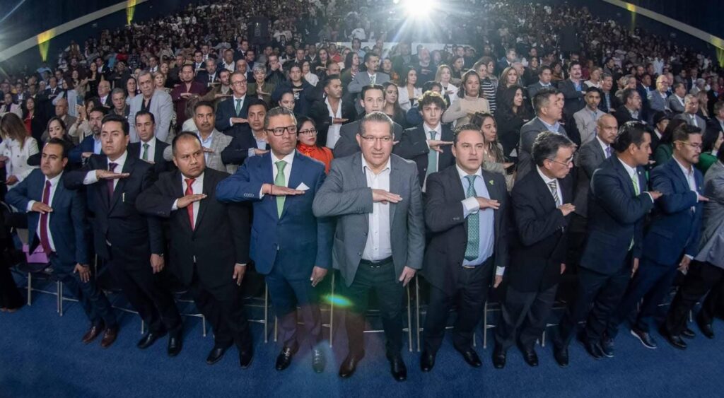 Acompañada por autoridades estatales y locales, incluyendo a José Castillo Ambriz, representante de la gobernadora Delfina Gómez Álvarez, y José Alberto Couttolenc Buentello, líder parlamentario del PVEM, la presidenta municipal entró al recinto para dar inicio al acto oficial.